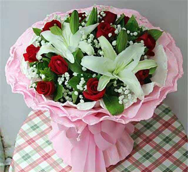 19朵红玫瑰1支多头白百合,白色包装纸包,包装大气,有卡片,如图