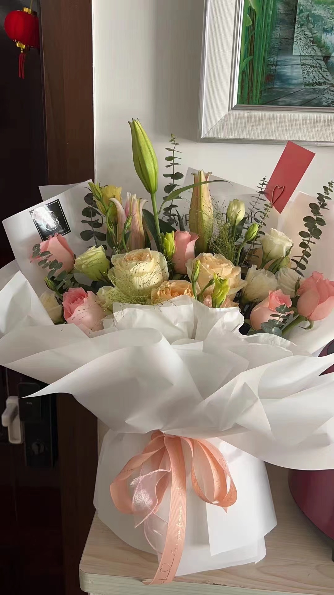夜上海论坛11支粉玫瑰2支白百合花束 +1盒巧克力,如图 |