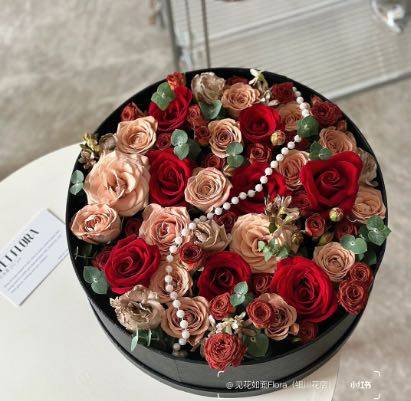 19支卡布其诺9朵红玫瑰加巧克力泡泡圆形礼盒 按图 |