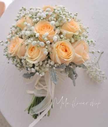 33朵红玫瑰白纱花束加皇冠+19朵香槟白满天星手捧花 |