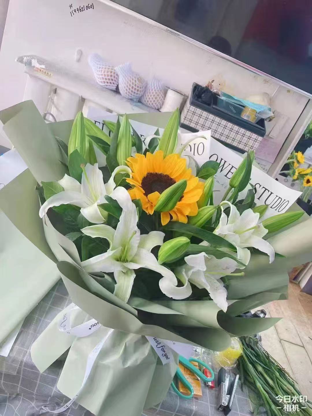 夜上海论坛6朵向日葵配洋桔梗花束. 数量:1 |