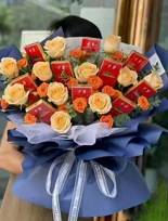 硬装中华香烟+11支香槟玫 橙芭芘花束+蓝色满天星硬中华花束(一束10包硬中华,按图包) |