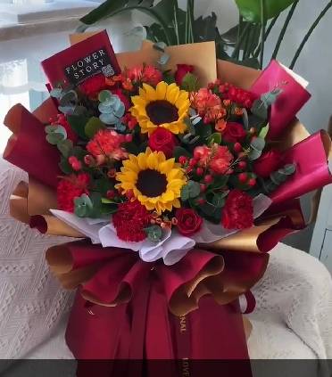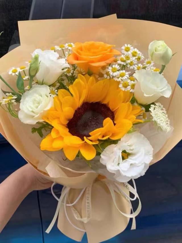 一朵向日葵配三朵香槟(图中的白色的花不要),送小男孩的。 |