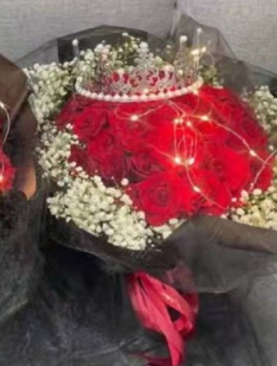 33支红玫瑰加紗加灯加皇冠款鲜花束 ,如图包