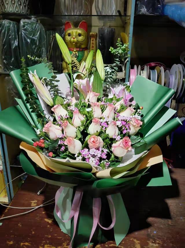 16朵爱沙,2枝多头粉色百合,加配花,如图包装