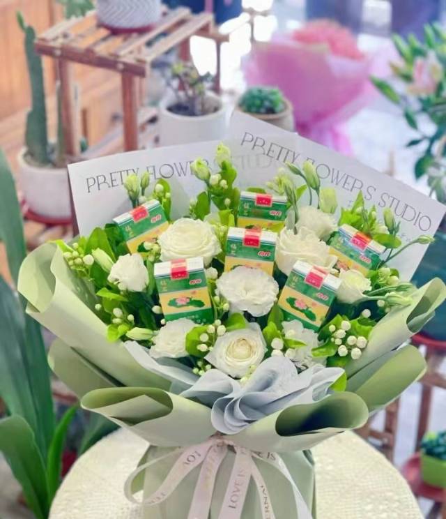 5支白玫瑰配白桔梗白茉莉花+5包荷花香烟花束,黑色包装纸 |