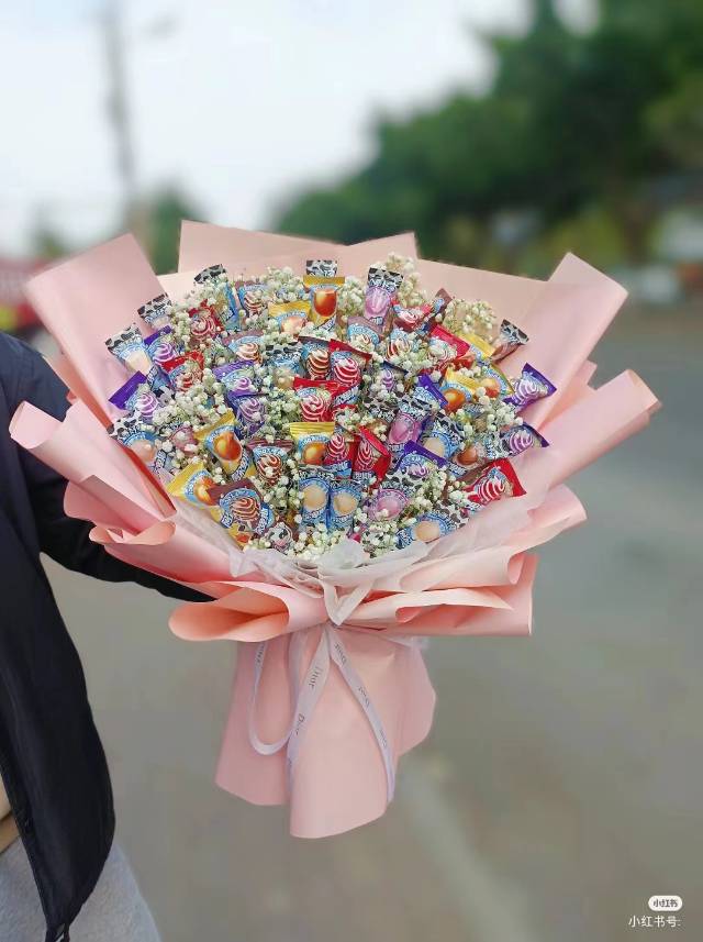 19枝粉色康乃馨巧配巧克力泡泡真花鲜花束,如图 |