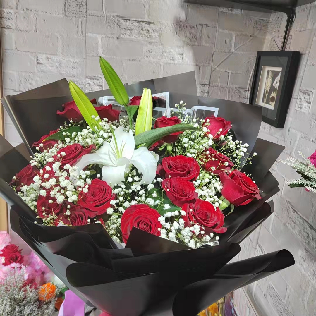 19朵红玫瑰2支粉百合混搭礼物韩式花束 按图 |