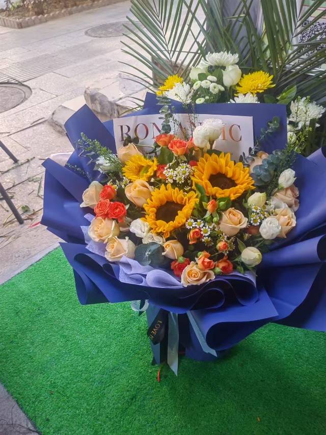 11朵香槟玫瑰3朵向日葵配洋桔梗跟橙色泡泡花束 |