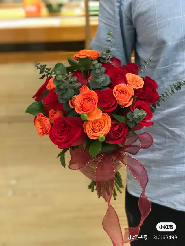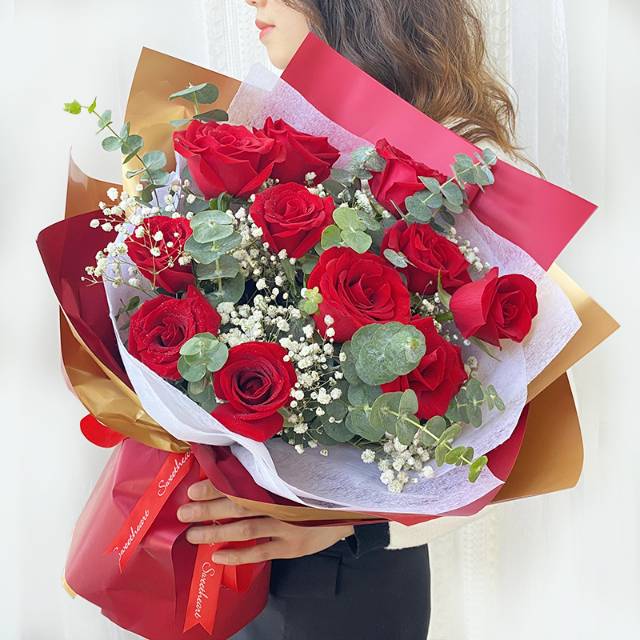 夜上海论坛11枝卡罗拉红玫瑰、搭配白色满天星、尤加利点缀 包装: 外围双色欧雅纸精美包装、内衬白色雪梨纸、酒红色丝带蝴蝶结束 |