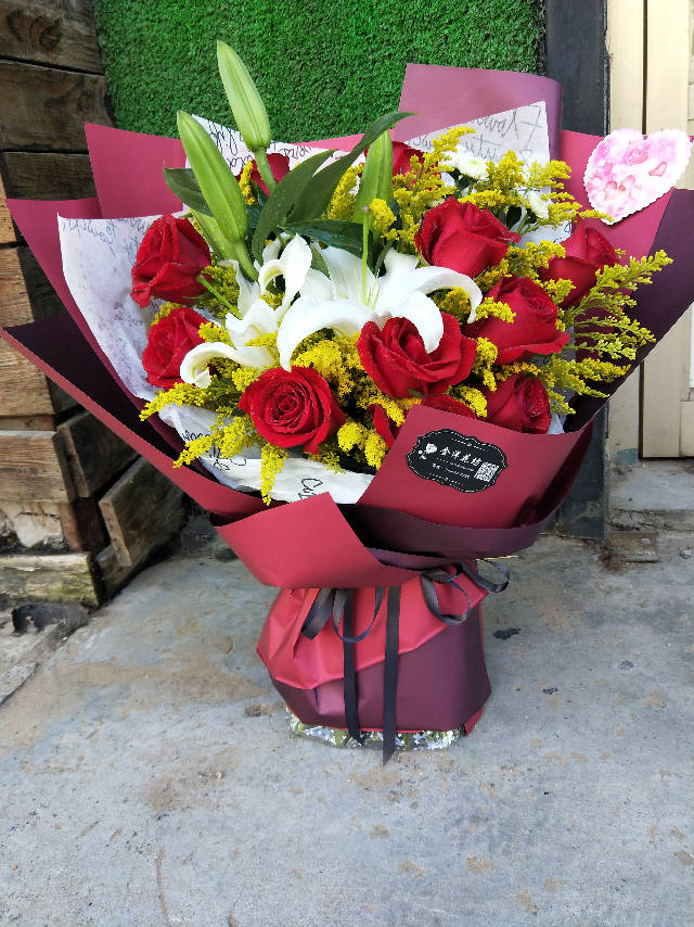 红玫瑰百合花束