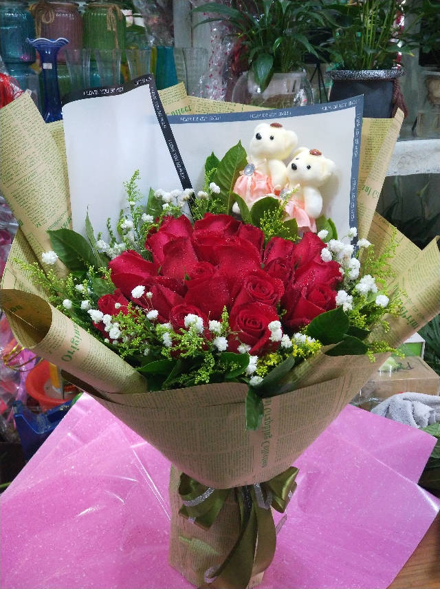 19朵红玫瑰,加2只卡通。