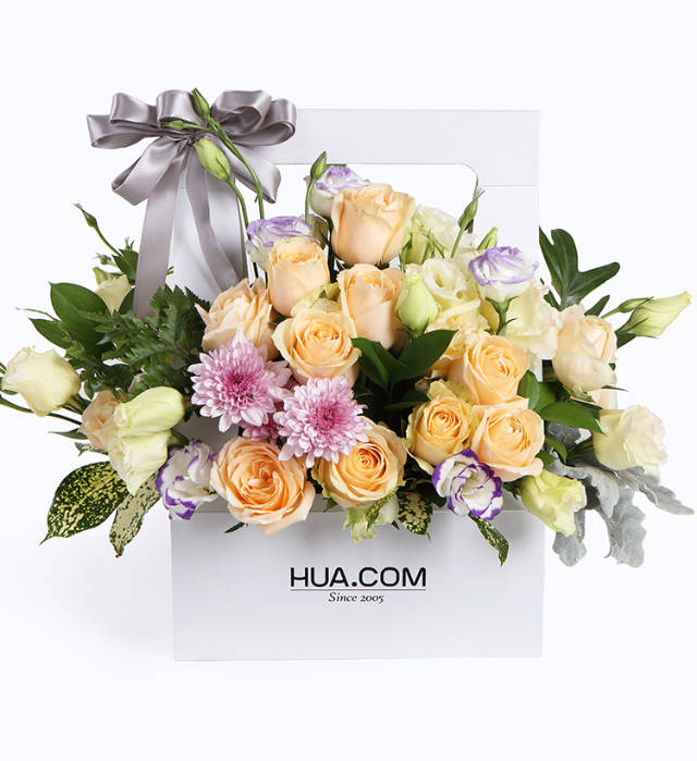 心晴.香槟玫瑰19支.香槟桔梗3支.紫桔梗2支