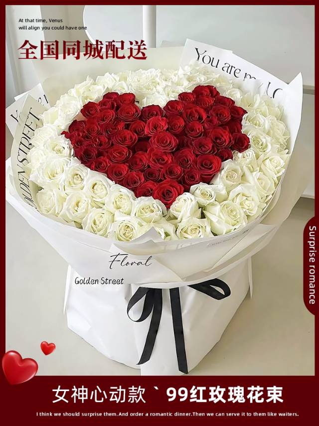 【心心相印】99朵红玫瑰白玫瑰花束