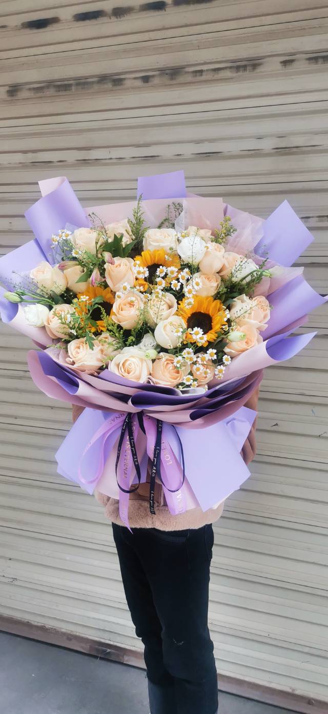 夜上海论坛21朵香槟玫瑰+三朵向日葵大型花束