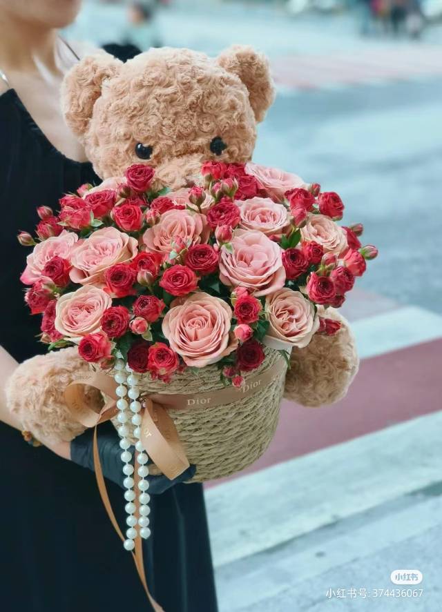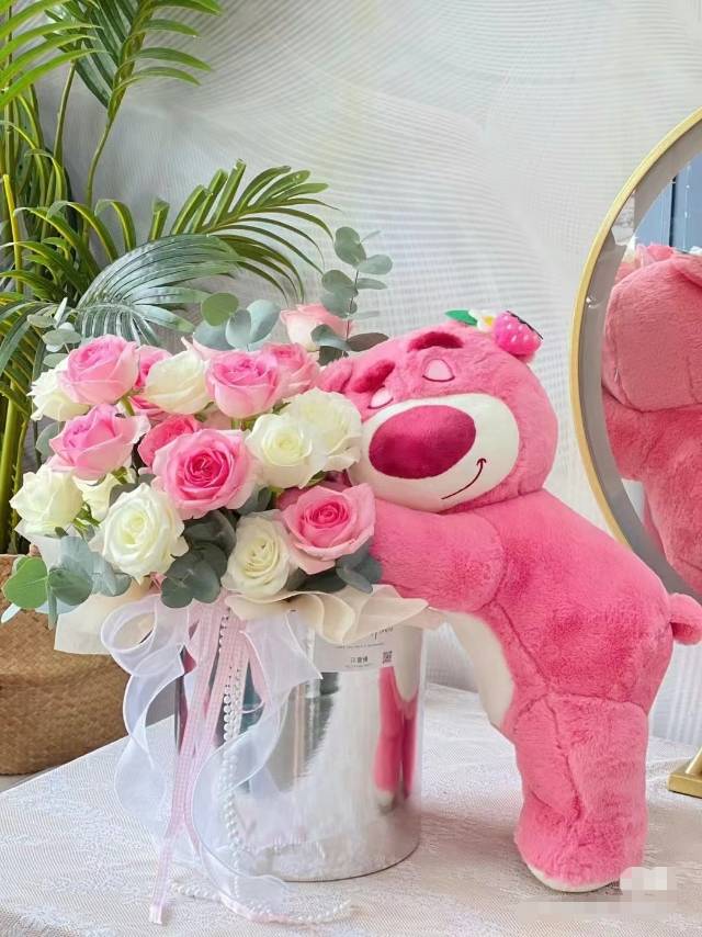 夜上海论坛【草莓熊玫瑰花束】29朵混搭玫瑰花桶送亲密女友送闺蜜送爱妻