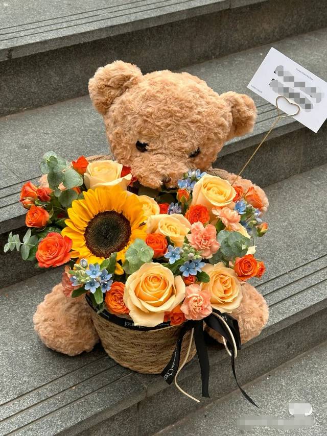 夜上海论坛泰迪熊抱抱桶1只向日葵混搭花束