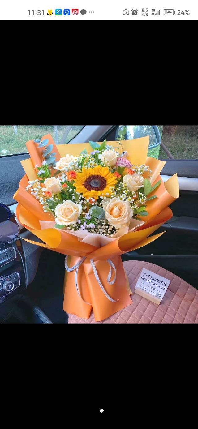 夜上海论坛1朵向日葵+6朵香槟玫瑰混搭花束